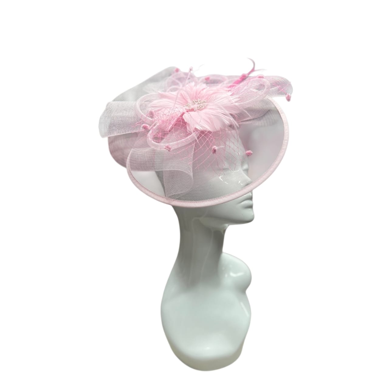Regular price $4.00Sale price $4.00 Regular priceUnit price / perCrafted from soft pink crinoline fabric, this large disc fascinator features a delicate feather flower, airy netting, and quill accents. The lightweight design weighs only 37 g,...