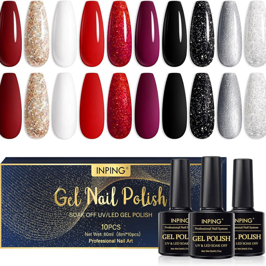 INPING 10-Color Red Black Glitter UV Gel Nail Polish Set.