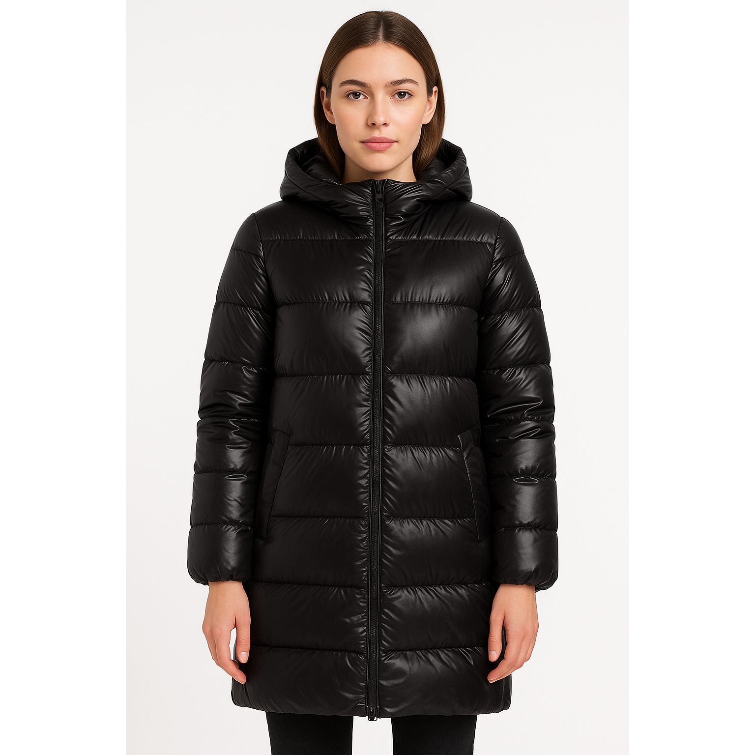 Regular price $59.00Sale price $59.00 Regular priceUnit price / perLong, quilted down-style puffer coat with a high collar and hood. Shiny/metallic black outer shell material gives a sleek, fashion-forward look. Horizontal baffles (puffy sections) across...