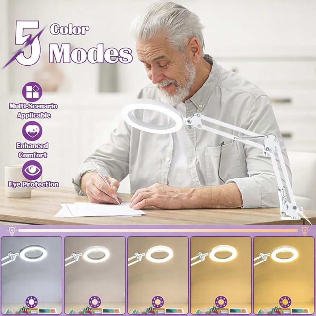 The 5‑inch real glass lens provides crystal‑clear 10X magnification for detailed work. A flexible swing arm and heavy‑duty C‑clamp securely attach to surfaces up to 6.6 cm thick, keeping the lamp hands‑free. Five color‑temperature LED settings and ten brightness levels let you customize lighting for crafting, sewing, painting, or reading.