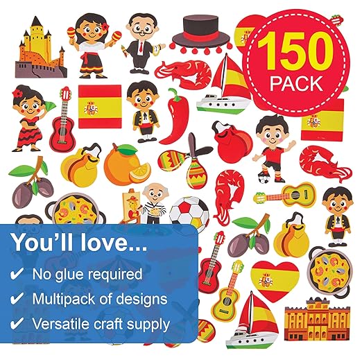 Add a splash of Spanish flair to any craft project with these colorful foam stickers. Kids can peel and stick designs like the flag, Paella, and Sagrada Familia onto cards, notebooks, or walls. Each sticker measures between 1 and 1.8 inches, making them perfect for both small and large creations. The set includes 150 pieces, delivering endless creative fun.