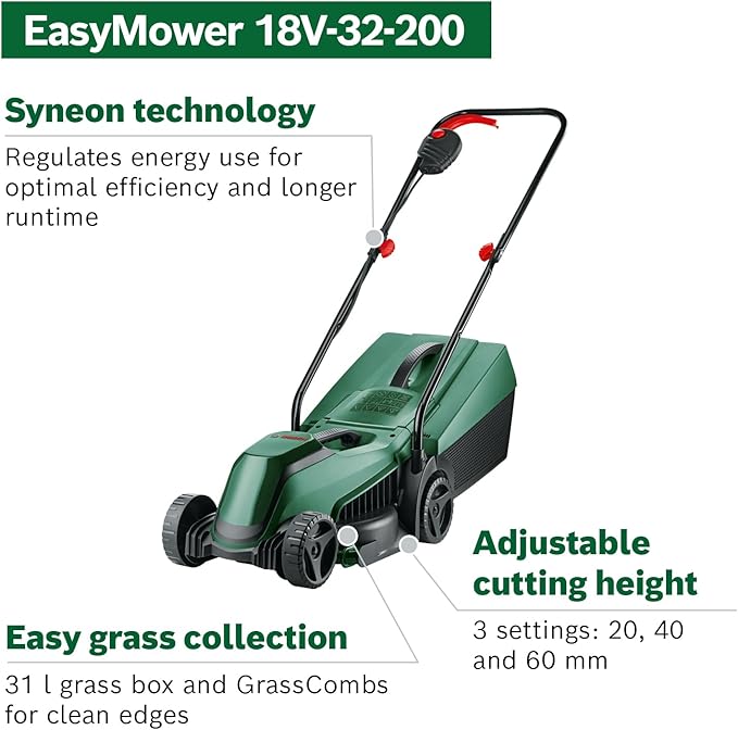 - Tags: 18v cordless mower, 32 cm cut width, Adjustable cutting height, Battery powered lawn mower, Bosch easymower, Compact lawn mower, Created by product upload, Grass catcher