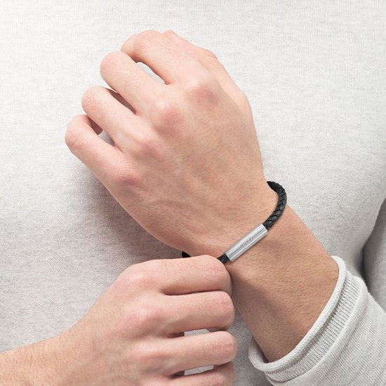 Add a touch of timeless cool to your look with this versatile men's bracelet. Crafted from sleek black braided leather and finished with a polished stainless steel magnetic clasp, it's the perfect accessory for any occasion. This stylish piece effortlessly combines modern design with classic appeal, making it a must-have for every fashionable man. Elevate your wrist game with this effortlessly chic and easy-to-wear bracelet.
