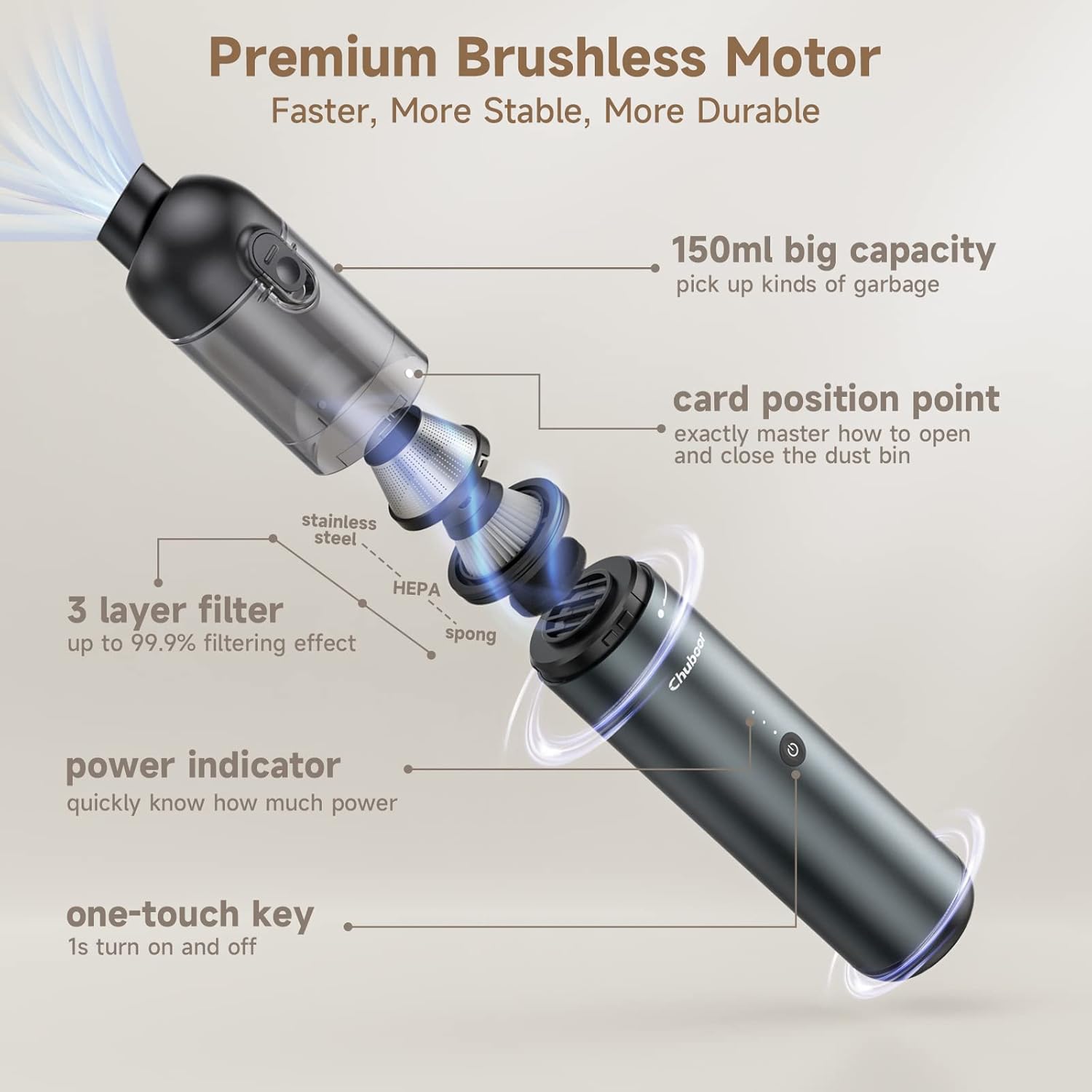 This handheld vacuum is a game-changer for quick cleanups around the house and car. With its strong suction power and lightweight design, you can effortlessly pick up dirt, dust, and debris. The washable HEPA filter and easy-to-empty dustbin make maintenance a breeze. Plus, the rechargeable battery provides up to 30 minutes of runtime, giving you plenty of time to get the job done. Whether you're tidying up after pets or just need a reliable vacuum for small messes, this handheld vacuum is the perfect solution.