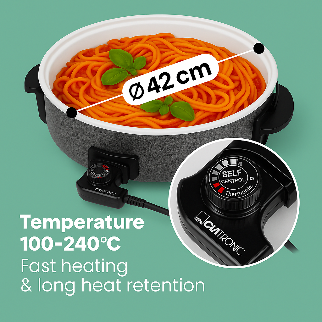 - Tags: Ceramic coated pan, Clatronic party pan, Created by product upload, Electric cooking pot, Electric roasting dish, Electric skillet, Kitchen appliance, Multifunctional pan, Pp 3570 c, Roasting pan, Thermostat pan