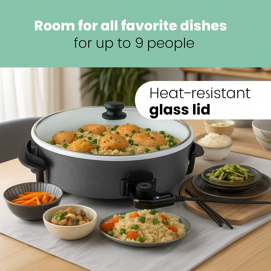 Whip up culinary masterpieces with this versatile party pan, perfect for cooking, roasting, and so much more! Its ceramic-coated roasting dish ensures even heat distribution and easy cleanup, making meal prep a breeze. The electric pot comes with a thermostat, so you can precisely control your cooking temperature for delicious results every time. This handy appliance is a kitchen superhero, ready for any recipe you throw its way.