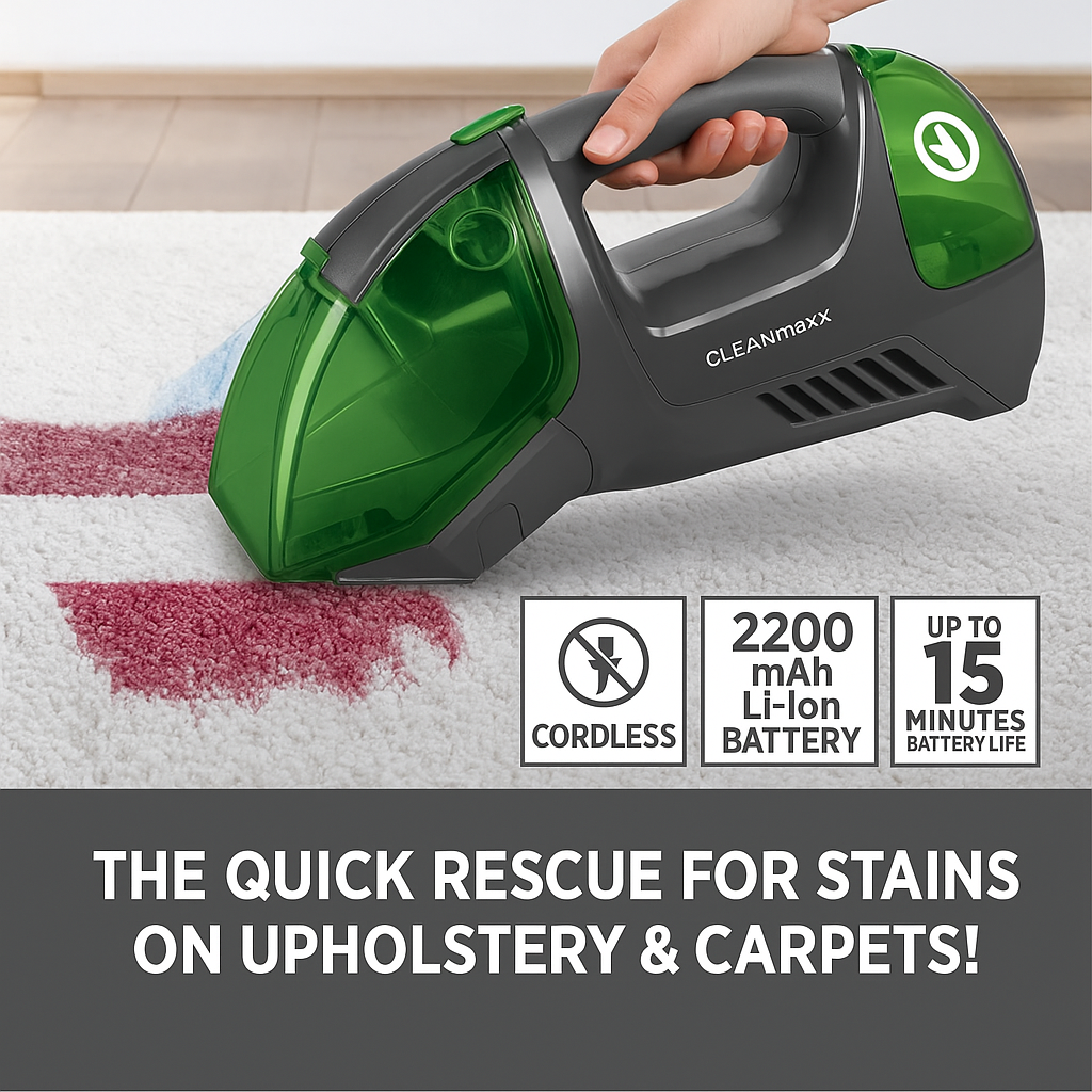 - Tags: Battery powered cleaner, Car seat cleaner, Carpet cleaner, Cleanmaxx, Cordless upholstery cleaner, Created by product upload, Handheld cleaner, Mattress cleaner, Portable cleaner, Spot cleaner