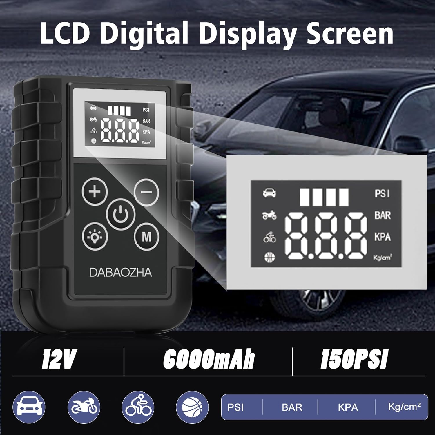 Meet the DABAOZHA 150 PSI portable air compressor, a pocket‑sized powerhouse that inflates car, bike, scooter and balloon tires in minutes. Its 4000 mAh lithium‑ion battery powers up to 25 minutes of nonstop pumping, while the built‑in LED lights up dark roadside emergencies. Switch between four preset modes or set your own pressure with the precise digital display that auto‑stops at the target. Compact, lightweight, and equipped with extra nozzles, it’s the perfect sidekick for any adventure.