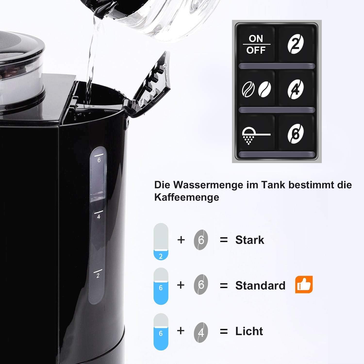 Bring fresh coffee from bean to cup with this fully automatic coffee maker, featuring a grinding system with 5 fineness levels. The reusable filter ensures a pure taste, and the machine automatically switches off after an hour for safety. Enjoy fresh coffee at home or share with friends and family. With its robust glass jug and ergonomic handle, this coffee maker is perfect for any coffee lover. The coffee maker is easy to use and clean, making it a great addition to any kitchen.