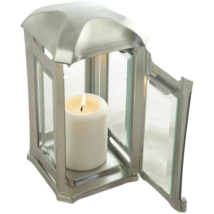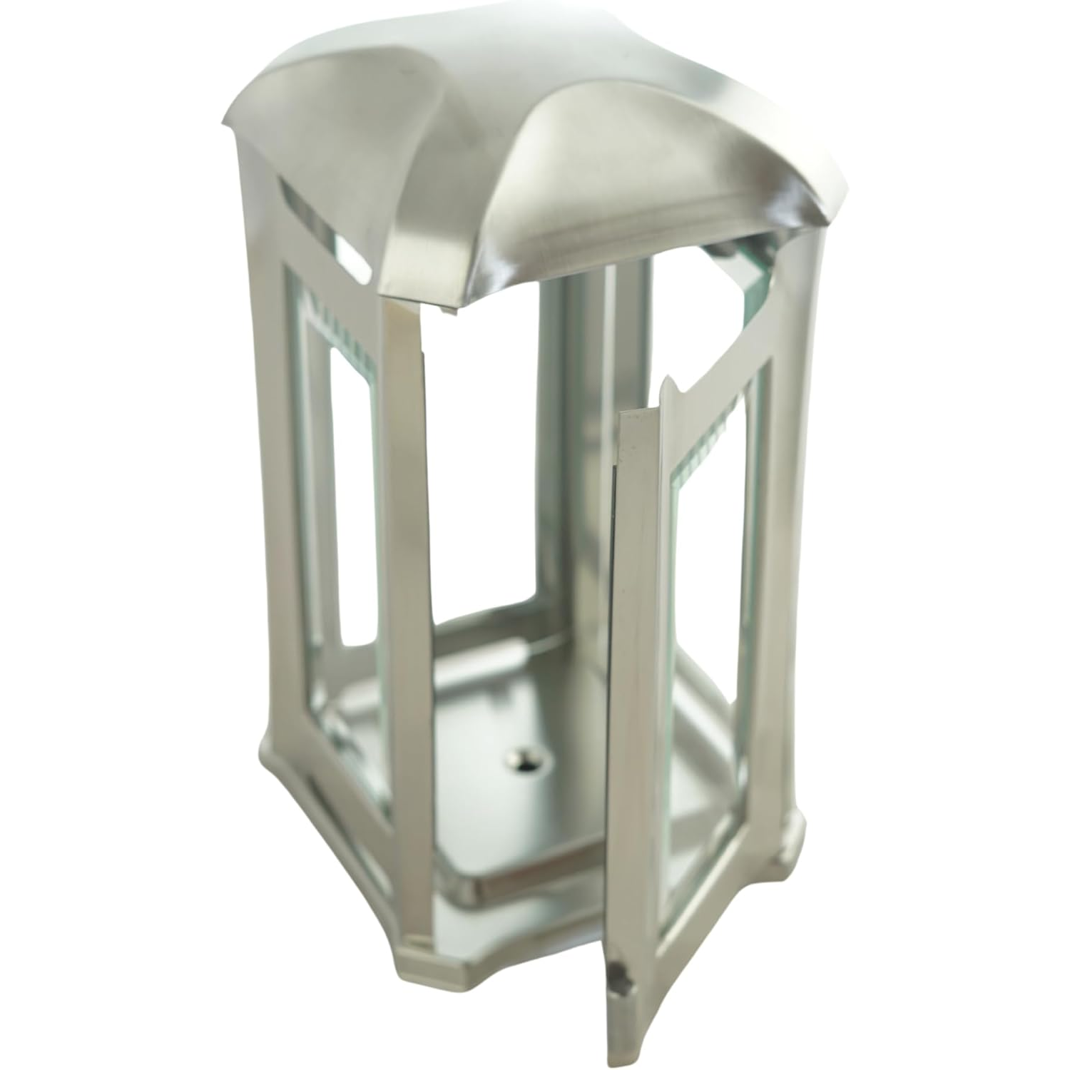A sleek stainless steel lantern , perfect for honoring loved ones with timeless style. The crystal‑cut glass window shines bright while the magnetic door makes candle changes a breeze. Weather‑resistant construction means it stands strong through rain, snow, or wind without a hint of rust. Fit classic wax candles or modern LED lights up to 9.5 cm in diameter for a warm, enduring glow.