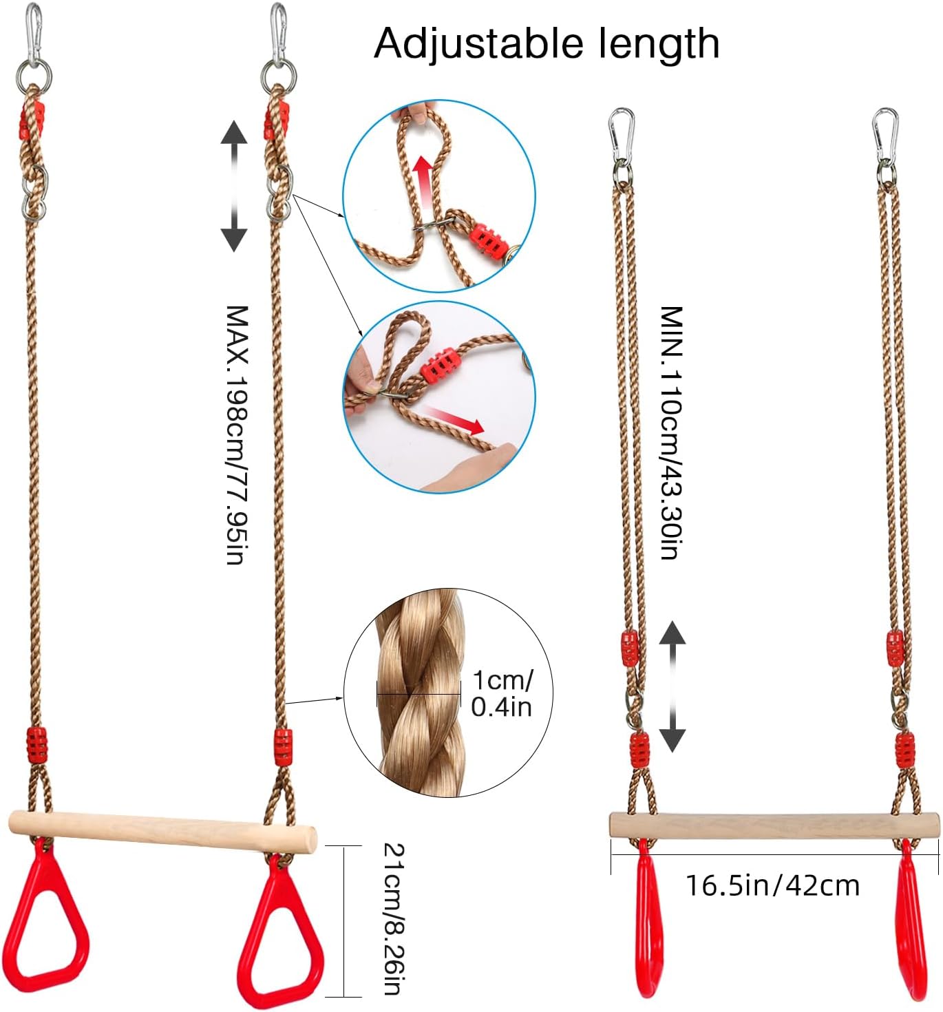 Durable Red Wooden Trapeze Swing with Adjustable Rope Rings