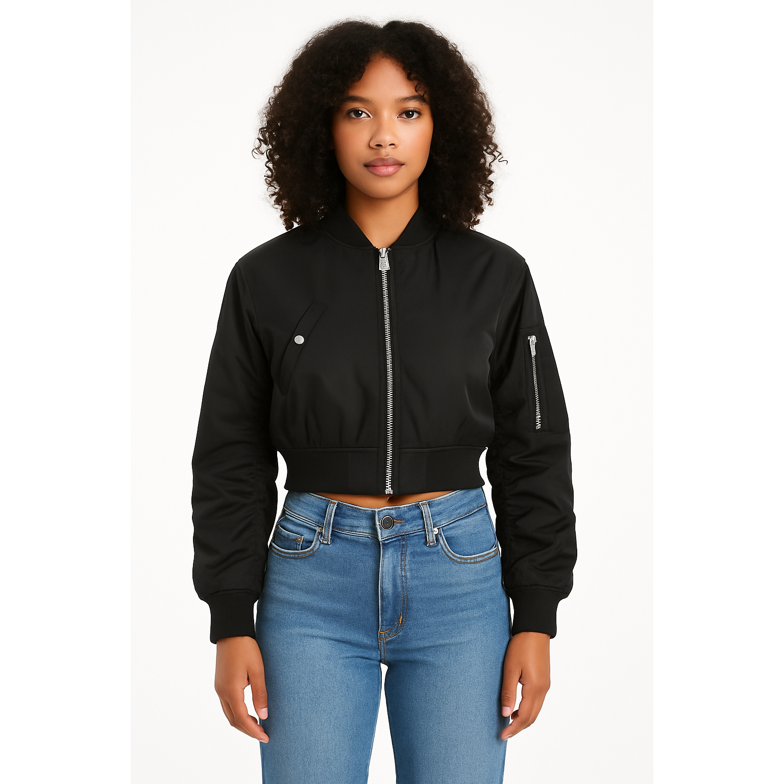 cropped black bomber-style jacket made from a sleek, slightly shiny fabric that gives it a modern and polished look. It features a silver front zipper, a zippered pocket on the left sleeve, and a snap-button flap pocket on the chest. The jacket has ribbed cuffs and waistband, creating a snug, fitted silhouette that emphasizes the waist. The sleeves are slightly gathered, adding a subtle puffed effect for a stylish, contemporary touch. Overall, it combines classic bomber design elements with a trendy cropped cut for a chic, versatile look.