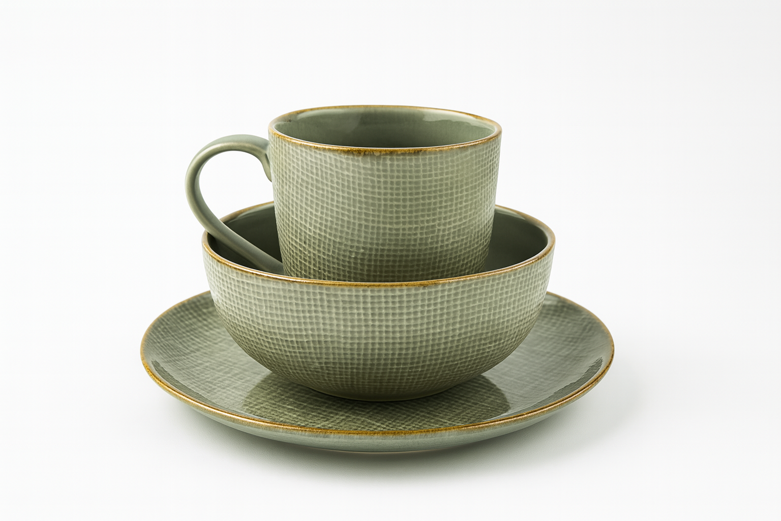 Elevate your everyday coffee or tea ritual with this beautifully crafted stoneware set, featuring a cup, deep saucer/bowl, and matching plate in a calming sage-green tone. Designed with a subtle woven-texture finish and warm, hand-brushed rim detailing, each piece blends artisanal character with modern elegance.