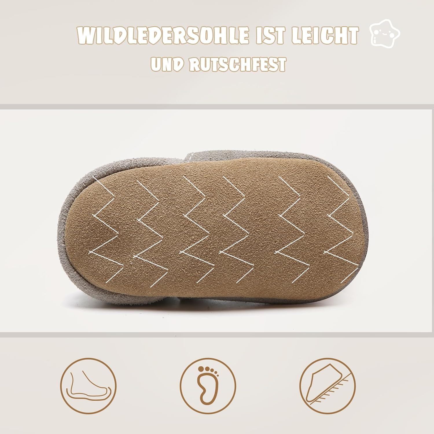 These ultra‑soft leather slippers let tiny toes explore the world with a gentle, flexible feel. A plush suede sole adds just the right amount of grip for crawling and early steps, while the cute animal designs spark imagination. Easy‑stretch elastic bands keep the shoes snug yet simple to slip on and off. Perfect for babies from 0‑24 months who need comfort and style in one adorable package.