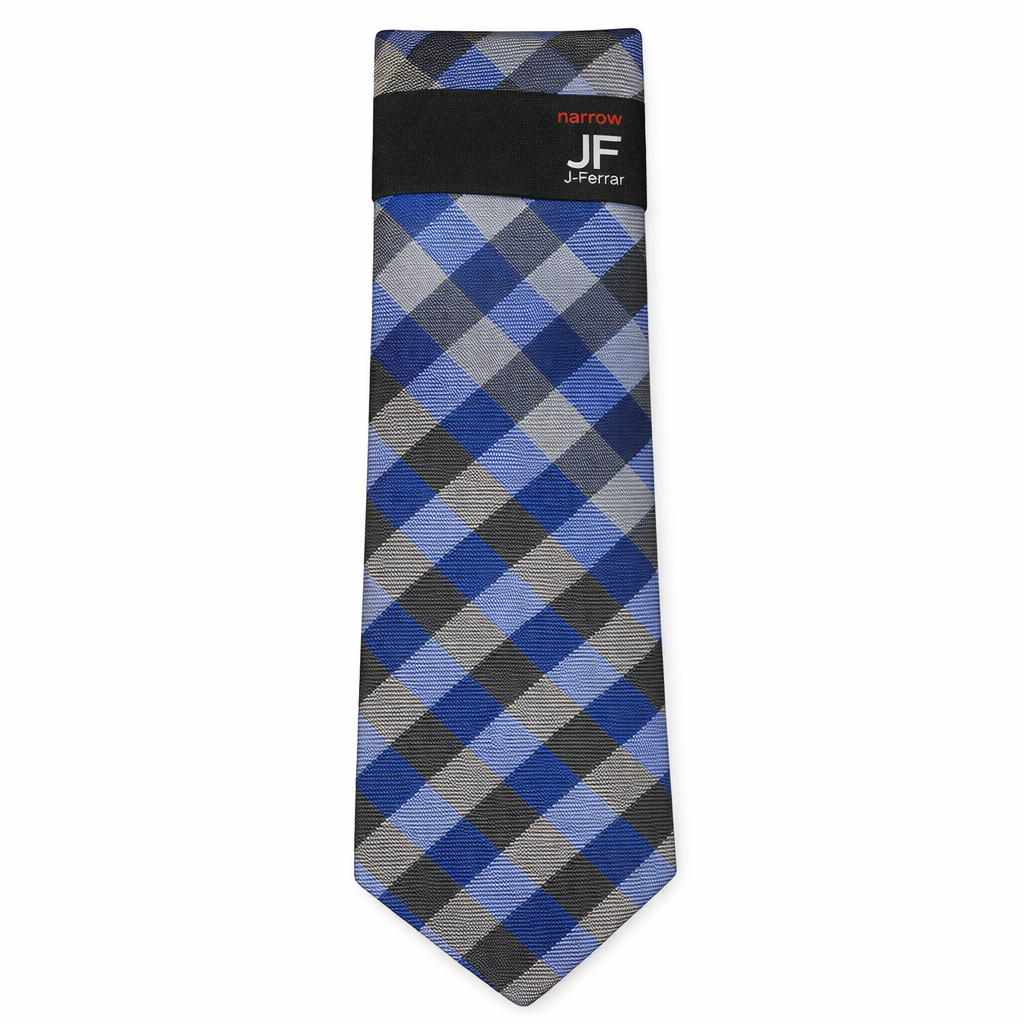 J.Ferrar Men's Checkered Tie, featuring a dynamic and bold plaid pattern in shades of blue, gray, and black. The squares form a visually striking design, combining darker and lighter tones of blue and gray, creating a sophisticated look suitable for formal and business occasions.
