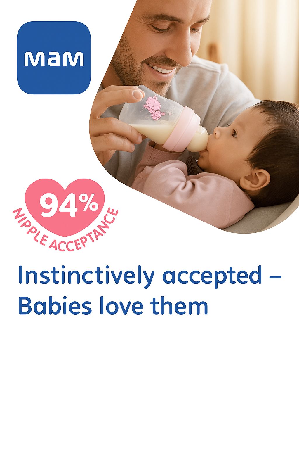 Soft teat - The teat of the drinking bottle for baby is suitable from 2+ months / from birth and is made of soft MAM SkinSoft silicone, which feels familiar in baby's mouth.