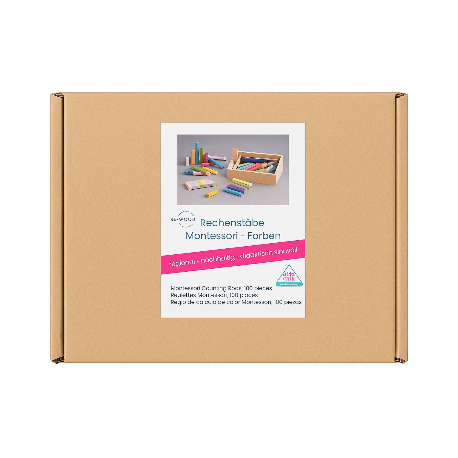 An educational set of 100 colorful counting rods made from eco-friendly RE-WOOD® material, designed to teach children basic math in a fun and hands-on way. The rods help kids understand numbers, arithmetic operations, and develop fine motor skills.