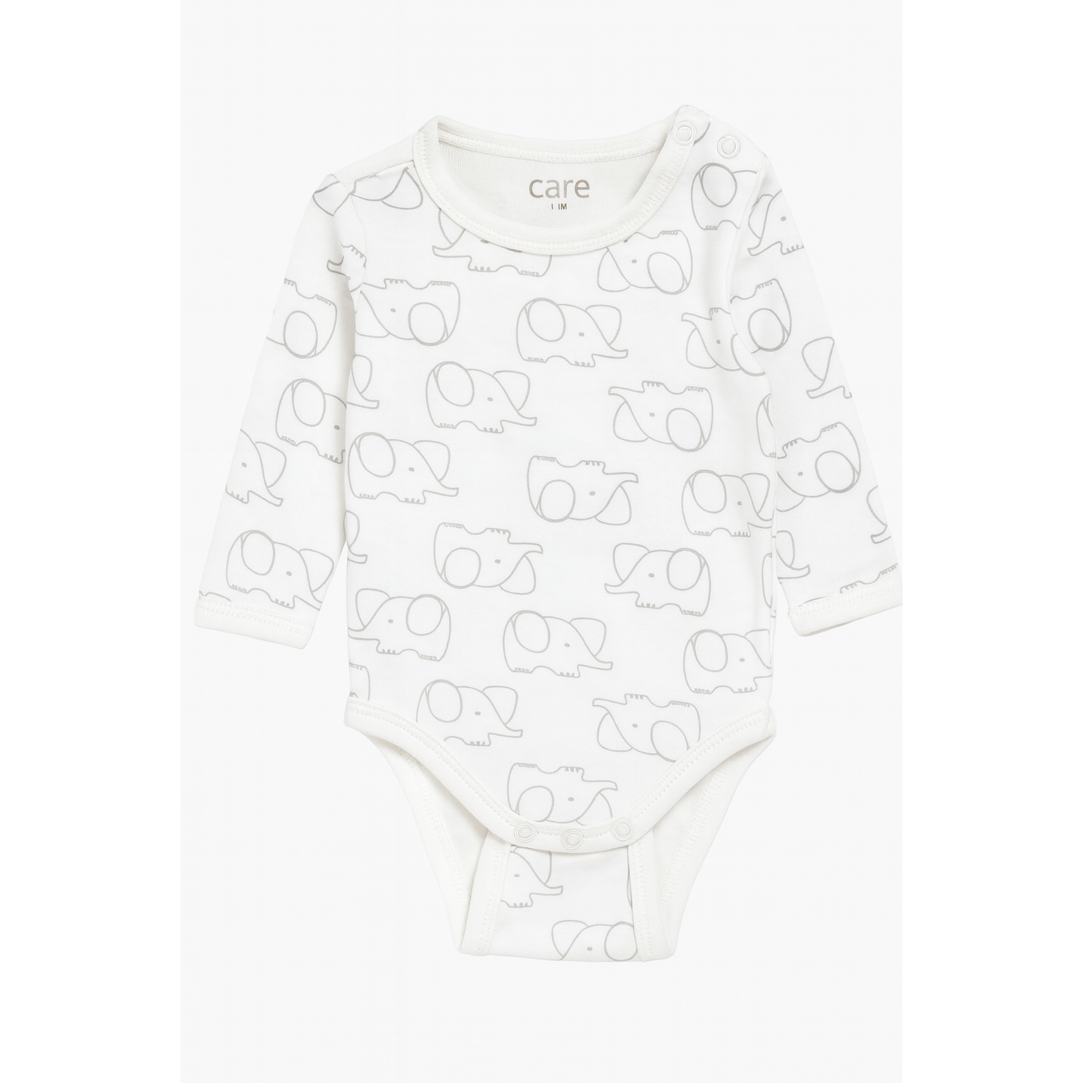 This charming set includes two soft long-sleeve baby bodysuits, perfect for everyday wear for newborns. The collection features one white bodysuit with grey elephants, another white with a stylish geometric grey pattern, and a cozy grey one adorned with classic white stars. These comfortable cotton blend bodysuits offer gentle comfort and practical snap closures for easy changes. Ideal for keeping your little one snug and fashionable during their first months.