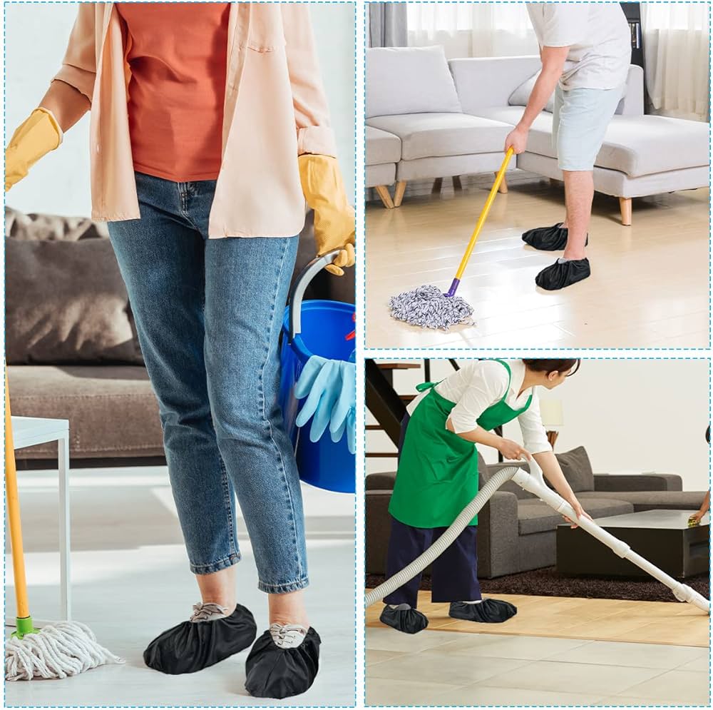 These reusable shoe covers provide a non‑slip grip and protect floors from dust and water. Made from durable, washable material, they fit most shoe sizes and stay securely in place. Ideal for indoor and outdoor use, they keep carpets and floors clean while extending the life of your footwear. The black finish offers a sleek look that matches any outfit.