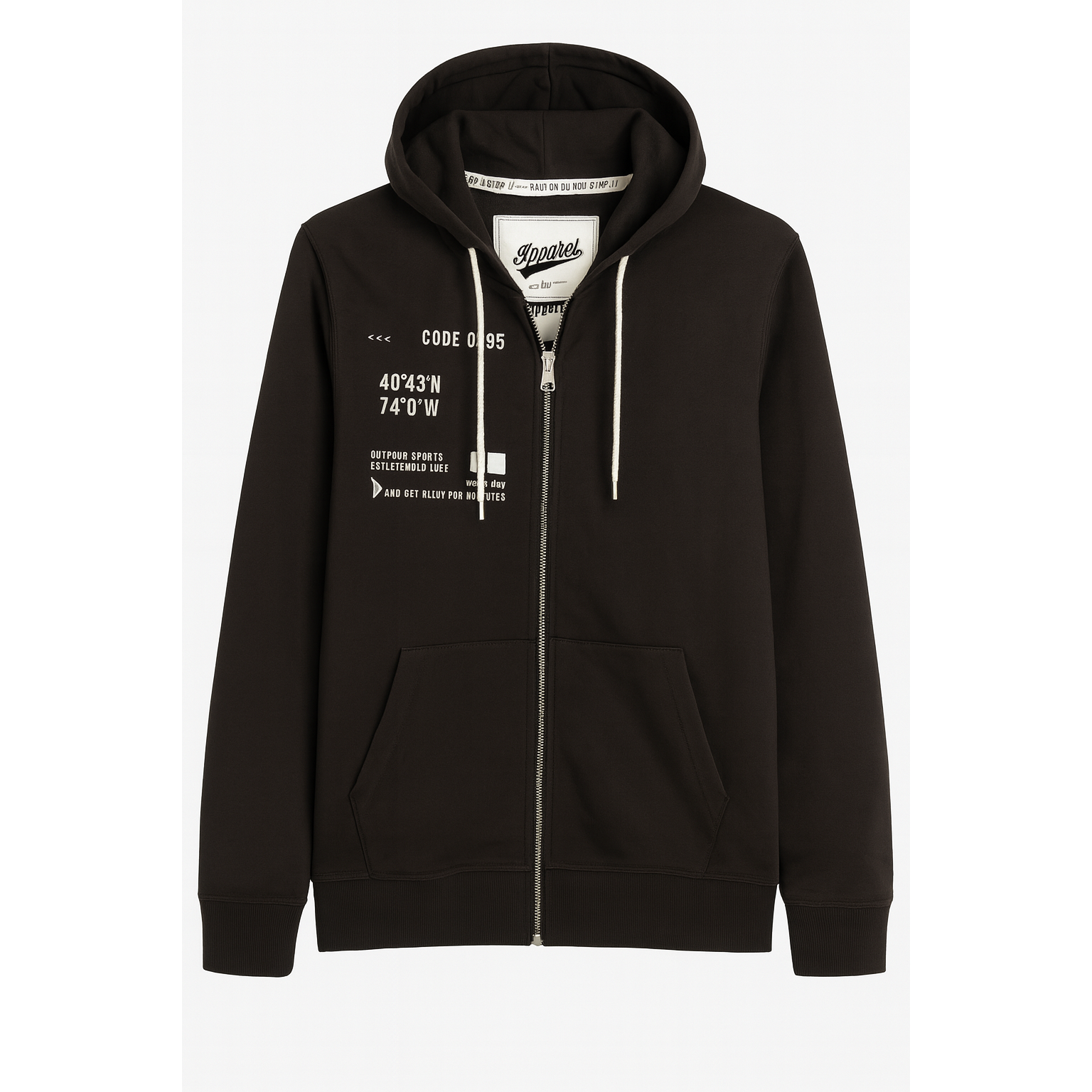 The design features a front zipper closure with a metal pull tab, ribbed cuffs and hem for a secure fit, and a double-layered hood with contrasting white drawstrings. Printed graphics on the left chest add a trendy, urban touch — including the text “CODE 0895,” coordinates 40°43’N 74°0’W, and “Outdoor Sports Established 1965” along with the “press play” symbol, evoking a sporty, dynamic lifestyle.