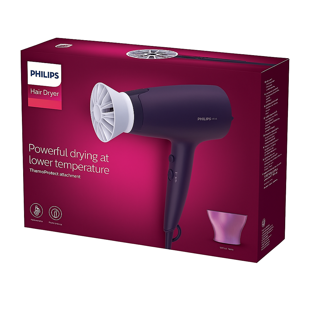 Meet the Philips 3000 Series Hair Dryer, your new bestie for powerful drying and everyday hair care. It's got a ThermoProtect attachment that blends warm and cool air, so your locks dry quickly while keeping heat damage to a minimum. With 6 heat and speed settings, including a cool air option, you've got precise control. Plus, the narrow nozzle is perfect for styling and those final touch-ups!