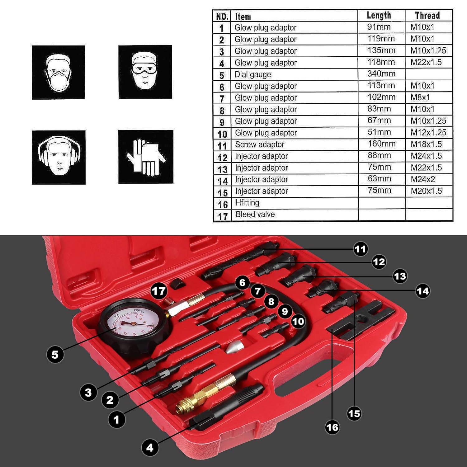 This diesel compression tester kit is your trusty sidekick for diagnosing engine issues with precision. It accurately measures cylinder pressure up to 1000 PSI, helping you pinpoint problems like worn rings or leaky valves. The comprehensive kit includes a variety of adapters for different diesel engines, making it incredibly versatile. Get ready to tackle engine diagnostics with confidence and ease, ensuring your vehicle runs smoothly.