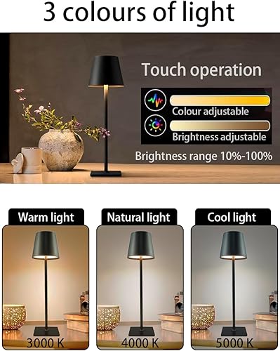 The Geolex Home rechargeable cordless table lamp offers versatile touch‑controlled lighting with three color modes and stepless dimming. Its built‑in 5200 mAh battery provides up to 48 hours of runtime and charges via USB‑C in 5‑6 hours. The matte black metal base is IP54 rated, making it suitable for indoor and outdoor use. Compact dimensions and a sturdy design make it ideal for bedside tables, desks, or patio settings.