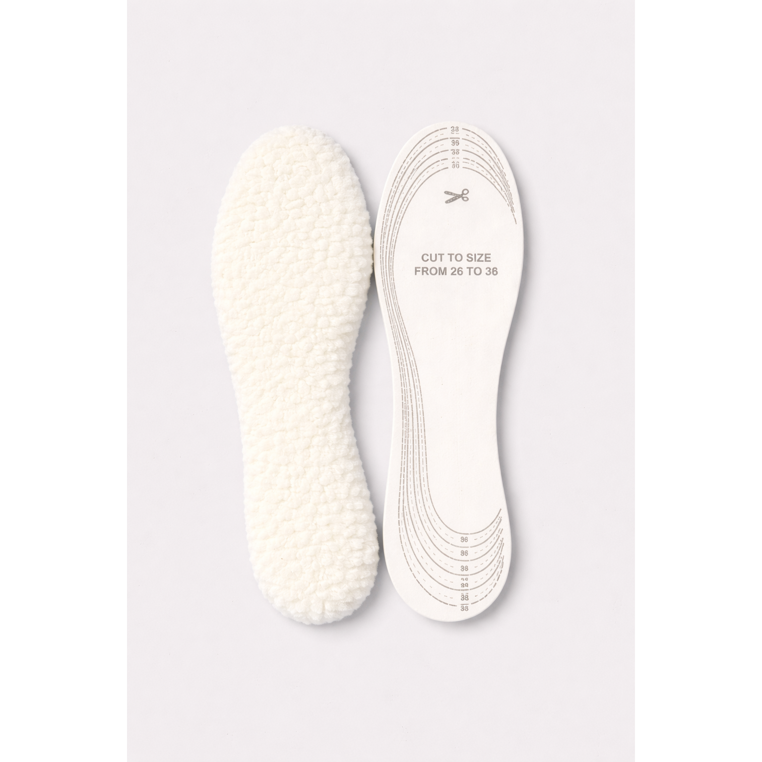 These wool sheepskin insoles provide exceptional warmth and cushioning for cold weather footwear. Made from faux wool, latex, and fiber, they soften impact and distribute foot pressure. The memory foam core can be trimmed to fit any shoe size using the built‑in size chart. Ideal for boots, sneakers, and casual shoes, they stay securely in place during movement.
