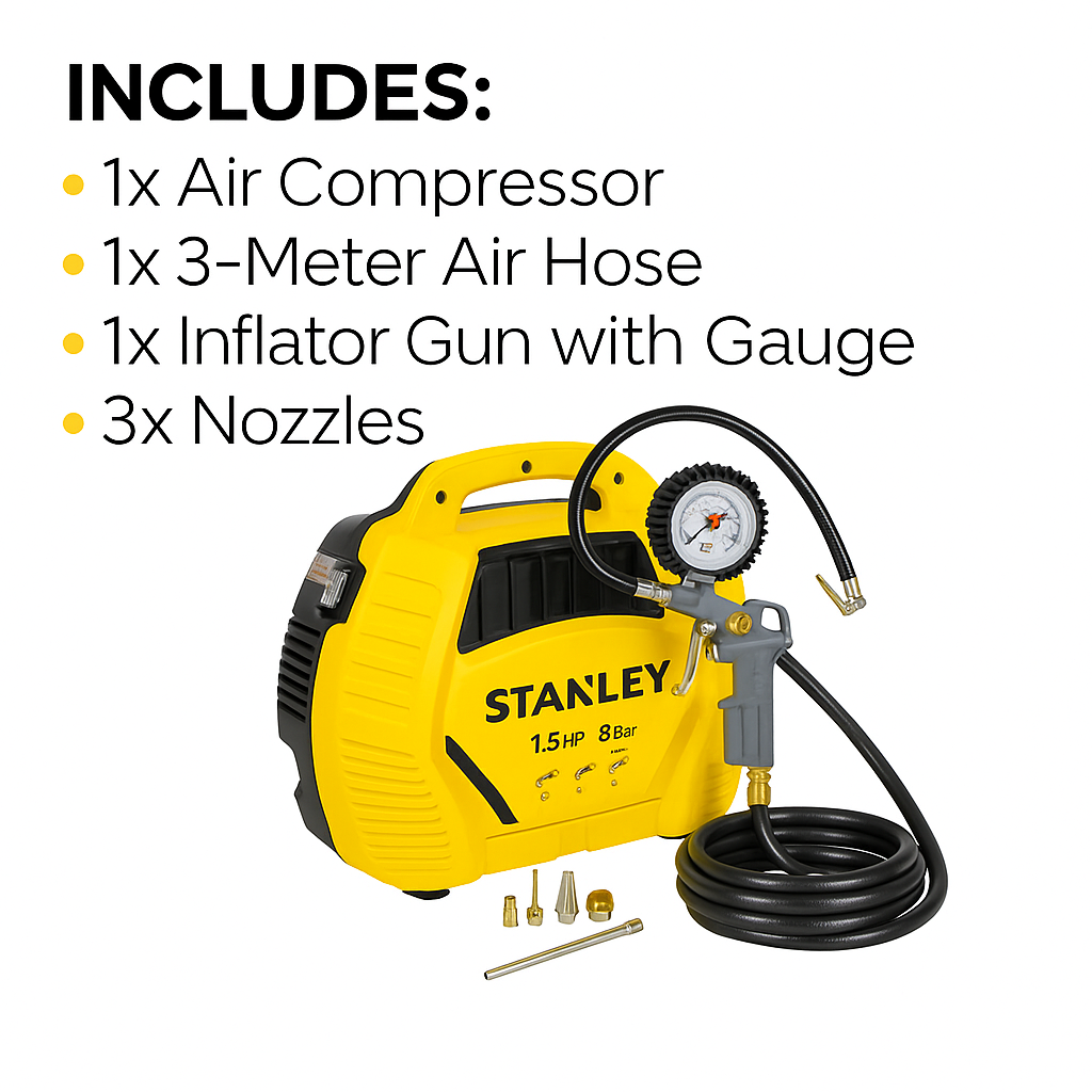 - Tags: 8 bar compressor, Air hose, Air pump, Created by product upload, Diy tools, Oil-free compressor, Pneumatic tools, Portable compressor, Pressure gun, Stanley air compressor, Yellow compressor