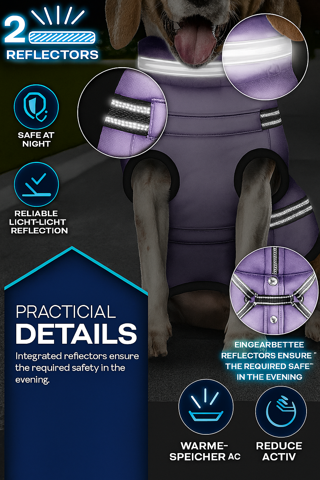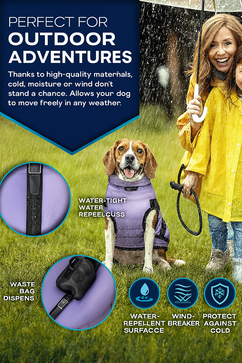| Features | Waterproof, Reflective, Harness integration, Leash hole, Padded |