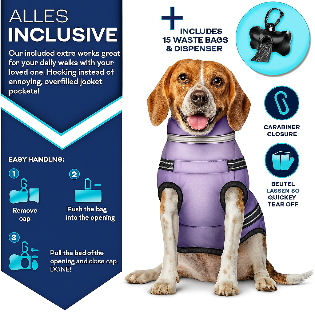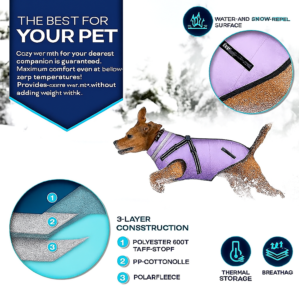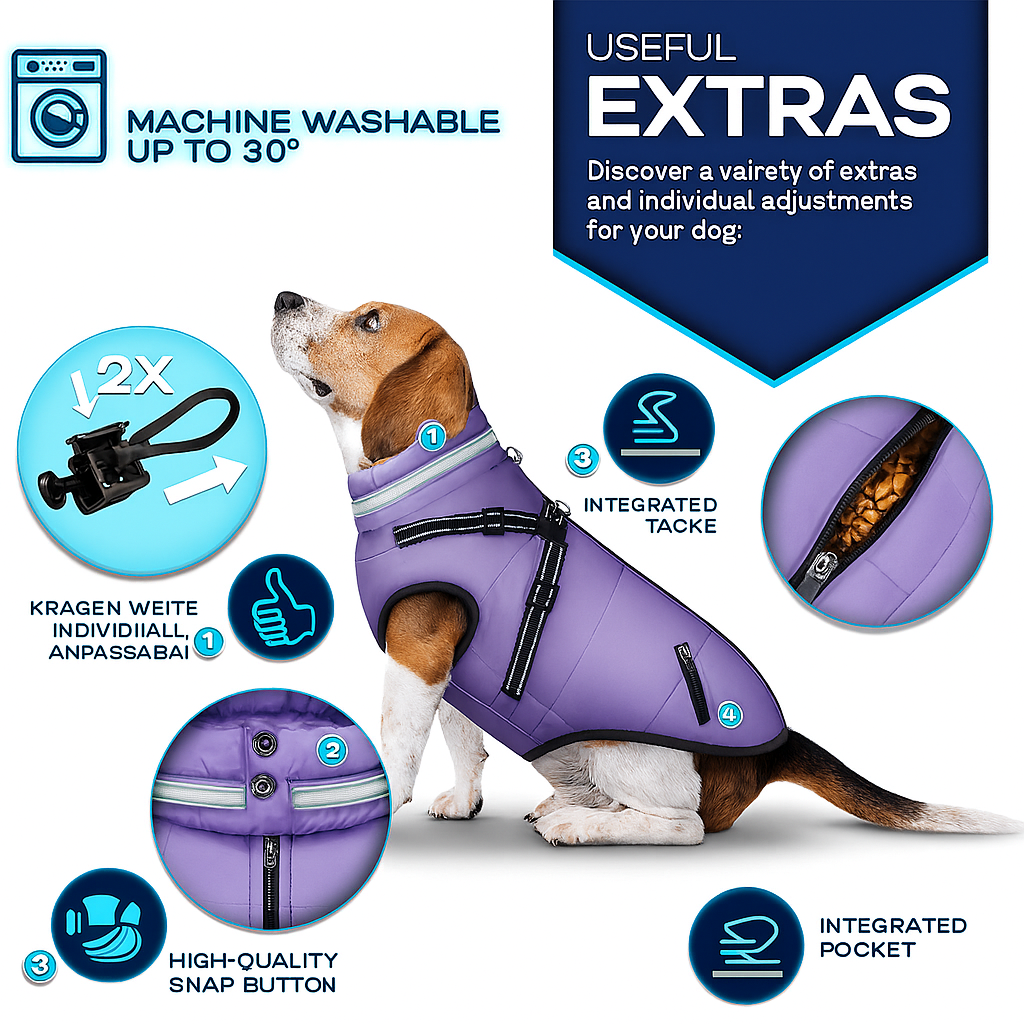 Keep your furry friend warm, dry, and visible with this Tresko winter dog coat. This waterproof coat features reflective elements for enhanced safety during walks. It also includes a built-in harness and leash hole for convenience. Your dog will be both snug and stylish on those chilly outings!