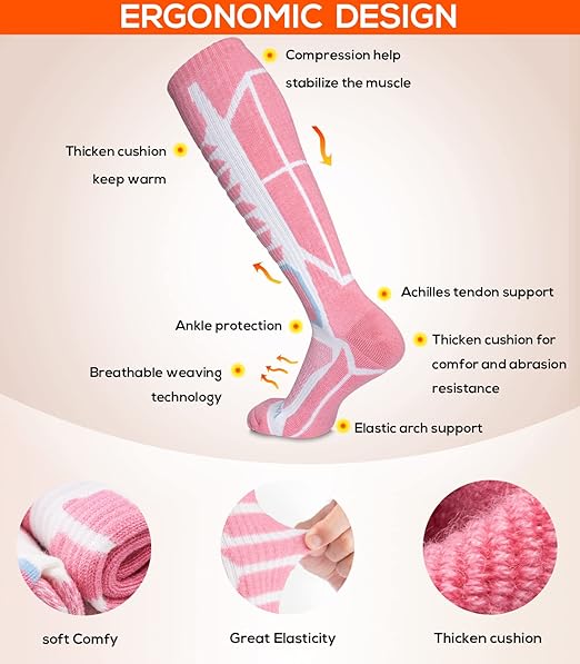 These knee-high ski socks keep your feet cozy on icy slopes with thermal padding that traps heat. Crafted from a soft cotton‑polyester blend, they wick moisture away for dry comfort. The vibrant colors and stretchy fit stay snug without squeezing. Perfect for skiing, snowboarding, and any winter adventure.