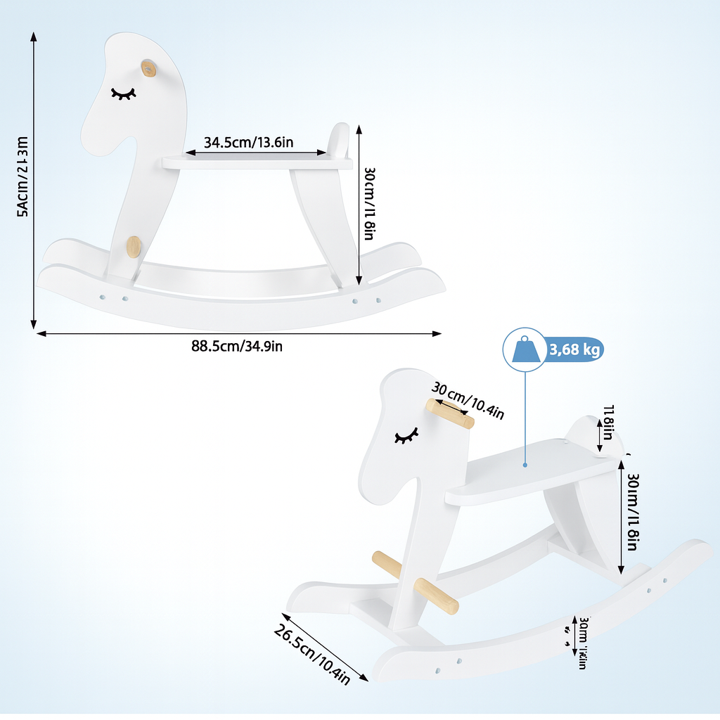 SAFE MATERIALS: The rocking horse made of MDF E1 and pine wood is painted with UV varnish. This children's toy is environmentally friendly, smooth, durable and can withstand up to 30 kg. Suitable for children from 18 months